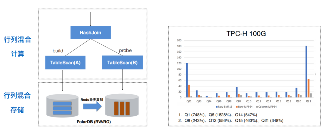 除此之外,就是提高存储方面的性能。从技术角度看,单独做一个行存、列存都不难,难的是做一个能够实时更新的列存。PolarDB-X采用的方案是在写入节点用行存,在只读节点用列存,中间通过redo做异步复制,实现列存的实时更新。基于这样的架构,就可以实现行列混存,行存承担高并发写入,列存承担复杂查询。结合MPP、行列混存、向量化等技术,PolarDB-X实现了TPC-H场景的5-10倍的性能提升。这一成果也即将在公有云上线,敬请期待。