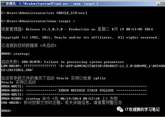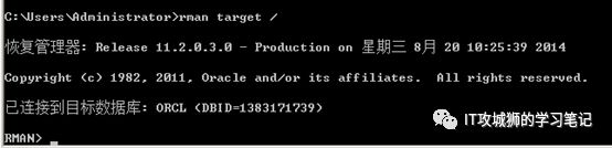 3、输入系统环境变量为set ORACLE_SID=orcl 然后使用RMAN登陆到数据库,启动数据库