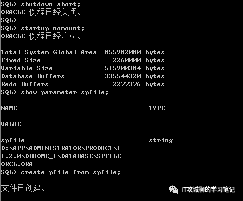 到ORACLE的路径里,删除SPFILE文件及PFILE文件,然后关闭数据库,再启动数据库会提示找不到参数文件