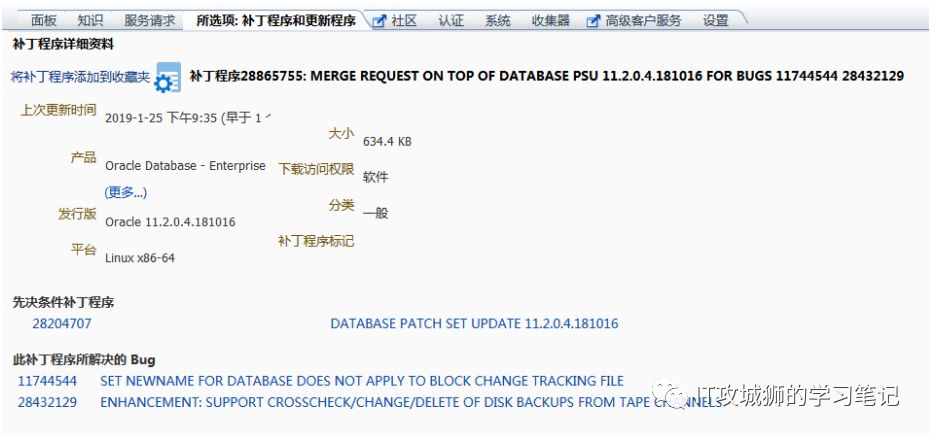 经过与备份厂商确认,是需要安装ORACLE补丁RMAN-06091补丁号28865755,到oracle 的SUPPOR上发现确实是这么一个补丁,补丁最后一次更新是2019年1月25日,但是关于补丁的BUG描述并没有详细记录。于是尝试安装该补丁。