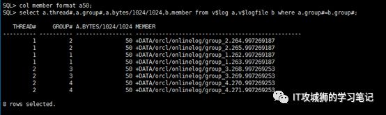selecta.thread#,a.group#,a.bytes/1024/1024,b.member from v$log a,v$logfile b wherea.group#=b.group#;