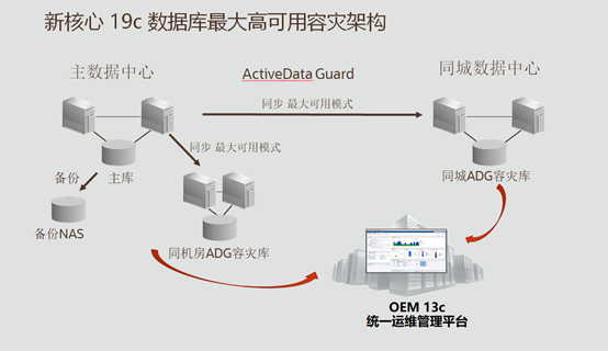 该新核心项目从2018年开始启动,由获得Oracle 19c认证的长亮科技进行核心应用开发。数据库采用Oracle 19c最大高可用架构(MAA)部署容灾环境,最大保护了核心系统的数据安全。在ADG部署上,所有容灾站点都采用RAC架构来确保容灾切换后本地高可用。使用Oracle Enterprise Manager 13c进行监控,管理及优化。Oracle ACS团队进场实施数据库架构及部署。实施内容包括核心系统数据库安装部署,ADG部署,数据库备份及恢复策略,OEM部署,系统上线支持等。系统上线至今运行情况稳定良好。