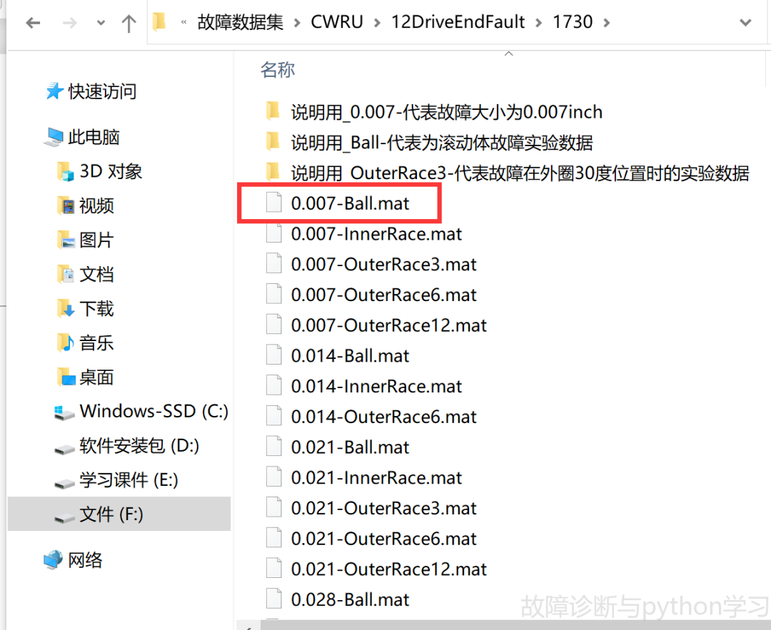 filepath = r'F:/故障数据集/CWRU/12DriveEndFault/1730/0.007-Ball.mat' #文件夹路径