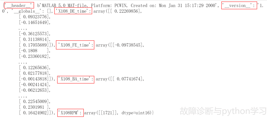 从结果可以发现这是{}包起来的,因此是一个字典类型,那这不就又到python熟悉的数据类型了嘛。字典是由键和值组成的(key-value),红框圈住的就是键。通过观察其键,我们所要的振动数据应该在'X108_DE_time'(),'X108_FE_time'()和'X108_BA_time'中。这分别为Drive End,FanEnd,Baseline放置的传感器获取的数据,而故障轴承放在Drive end,故'X108_DE_time'()对应的数据更靠近真实数据,从而噪声数据更小,故障信号更明显。