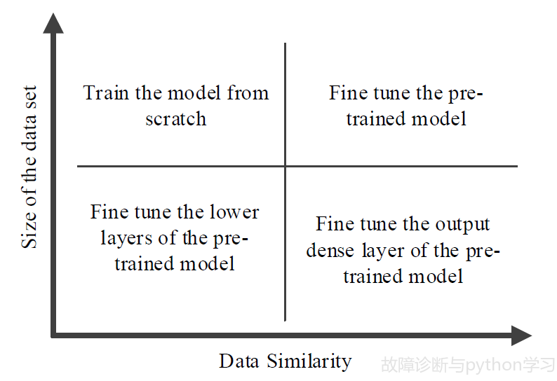 我们知道,准确的分类性能不仅取决于训练数据的质量,还取决于CNN模型的合适结构和训练参数。到目前为止,轴承故障诊断深度学习中的数据驱动方法主要包括时域信号、频域信号和时频图像三种数据形式。但是,由于输入数据的大小不同,CNN的层数和训练参数也不同,没有一种适用于不同轴承的通用方法。换句话说,不同的轴承需要建立不同的CNN模型。因此,由于CNN的框架和训练参数的选择并不容易,主要依靠人类的先验知识,因此构建最优模型需要花费大量的时间。幸运的是,迁移学习可以利用已构建的结构或记忆参数,继承其他预训练的CNN模型的优点,避免了之前知识的不足,节省了大量构建新模型的时间。迁移学习的调整主要取决于两个因素,即数据集的大小和数据相似度,如图 1所示。Alexnet作为一种优秀的模型,其输入尺寸为2维图像(224×224×3)[16],具有良好的分类性能和网络结构。振动信号的时频分析图像易于满足Alexnet的要求。最重要的是,不需要担心数据长度的多样性,任何时域轴承振动信号都可以方便地转换成时频图像。
