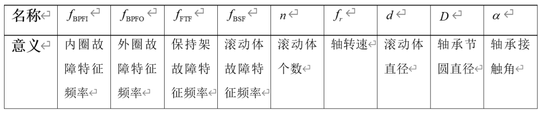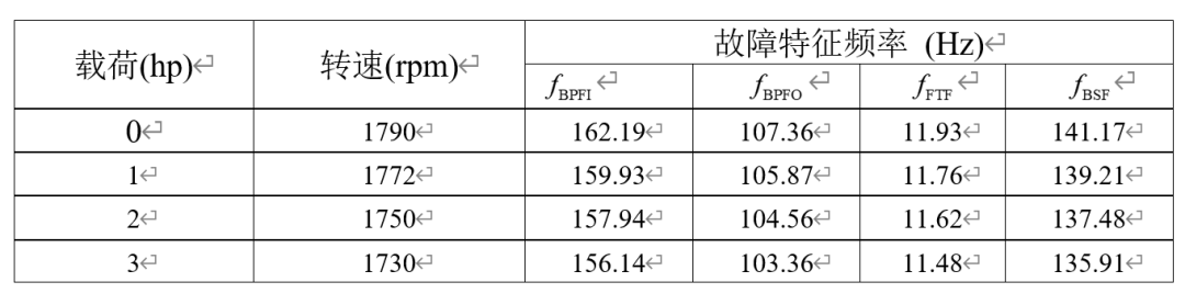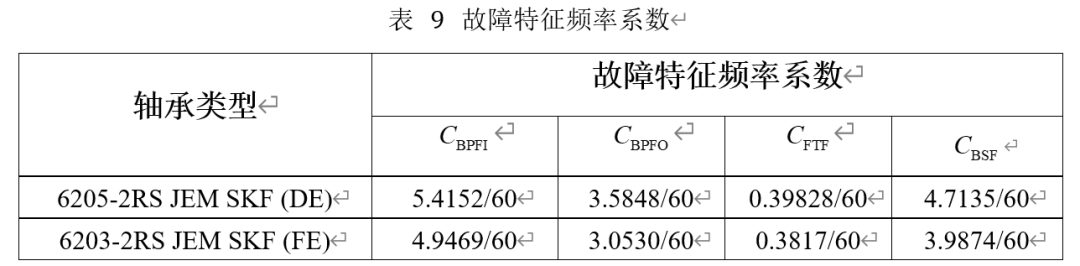 根据轴承尺寸参数可算出轴承故障频率系数。其结果如表9所示。值得注意的是,表格里的系数都除以了60。这样故障特征频率系数才能直接和单位为rpm的转速fr相乘得到故障特征频率。