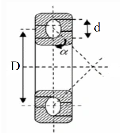 图7为滚动轴承剖面图。d滚动体直径,D为轴承节圆直径,α为接触角(载荷与径向平面的夹角)。