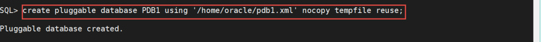 刚才我们在upgr环境下生成了upgr的描述文件,现在我们在cdb2的环境下执行插入动作。请注意,这个操作是在cbd2环境的SQL Plus当中完成的。我们将upgr这个数据库插入到cdb2当中,给它的新名字是pdb1。