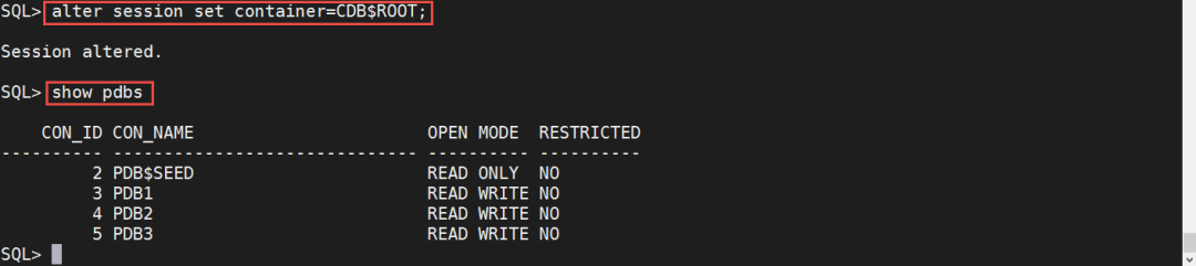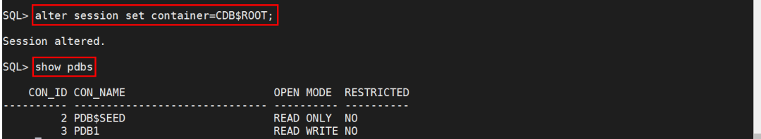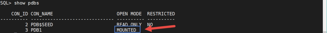 接下来,我们来到容器数据库,看看pdb1的状态。