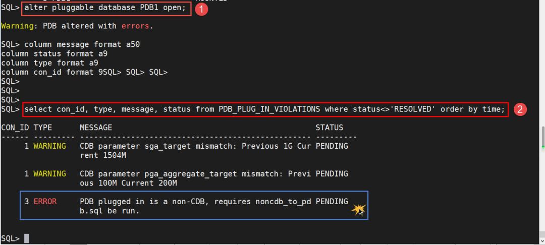 大家通过观察发现,我们新插入的数据库pdb1(原来的upgr),只能启动到mount状态,我们尝试启动它,会收到如下错误信息。告诉我们要执行一个脚本,将原来的non-CDB进行转换。