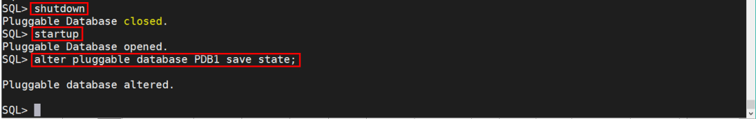在这里,我们将刚转换好的pdb1先关闭,然后再打开,之后执行save state。这些操作都是在pdb1的环境当中完成的。您接着上面的会话直接执行就可以了。这里给大家留一个小问题,我们执行save state的目的是什么呢?执行之后,我们在下次打开数据库的时候会怎样呢?请大家自己去网路上检索答案。