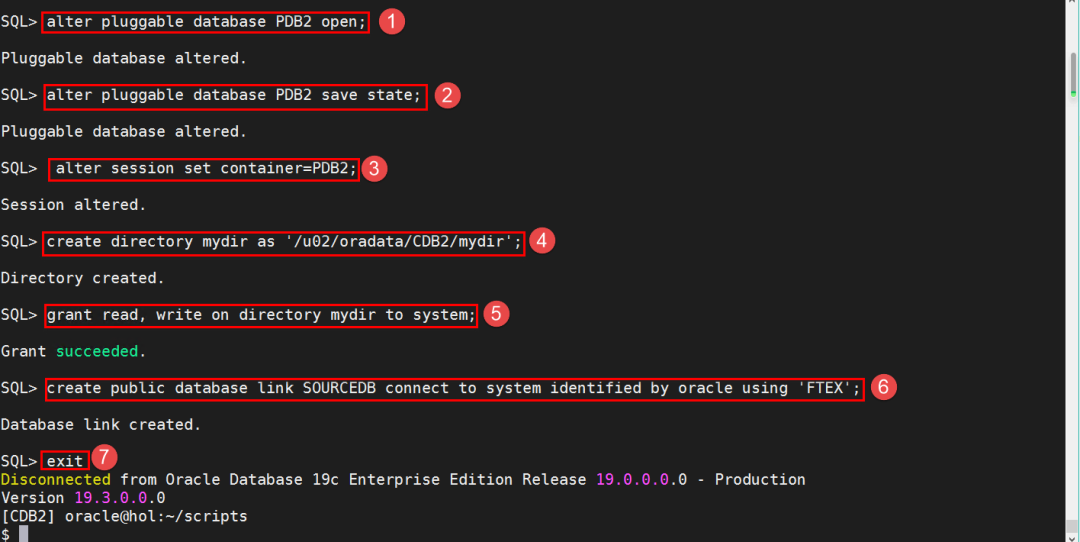 我们将pdb2打开之后,创建一个目录对象,并给system用户授予访问权限。之后我们创建一个指向11.2.0.4数据库FTEX的database link。