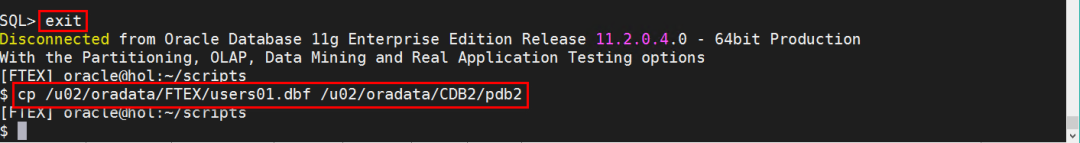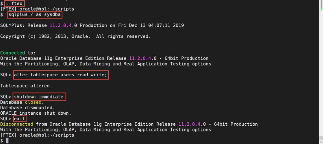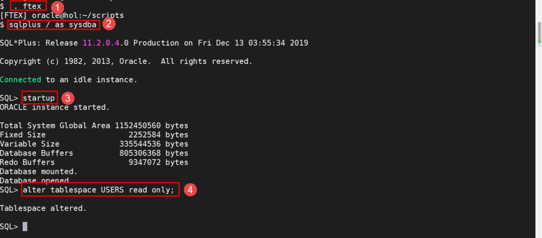这一步,我们先来到FTEX数据库,将要导入的表空间设为只读模式,之后在操作系统上,将这个表空间的数据文件复制到19.3的环境下。