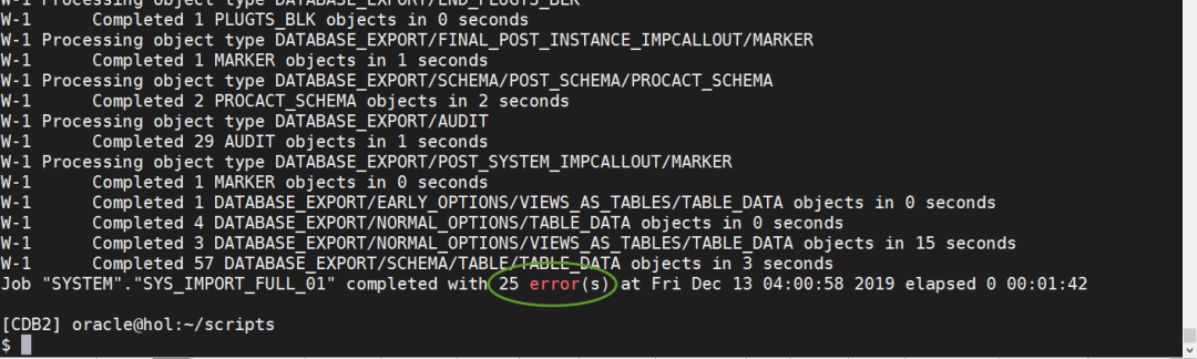 来到cdb2,使用数据泵导入,这个操作要执行几分钟。执行结果有25个错误,暂时不必理会。