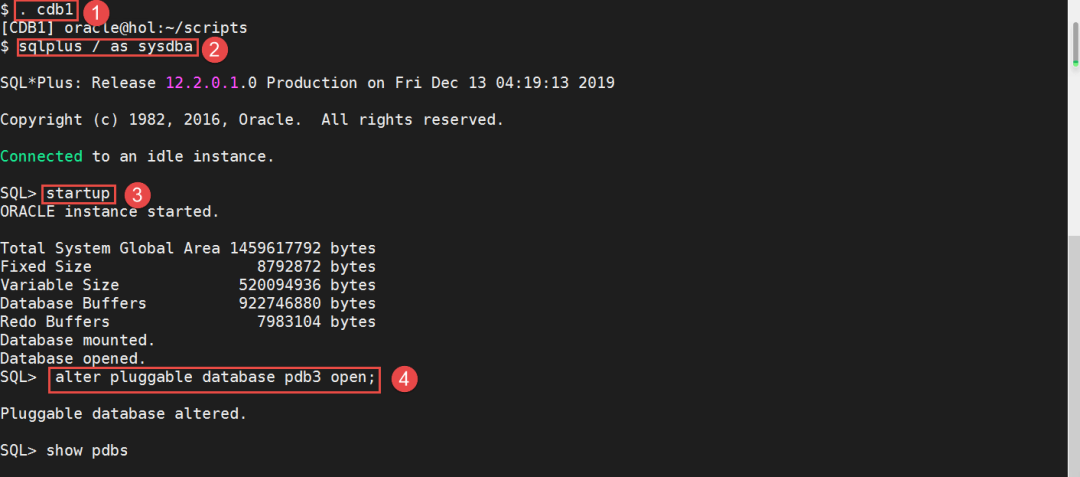 第一步:我们先来到12.2.0.1数据库cdb1的环境,将当中的pdb3打开