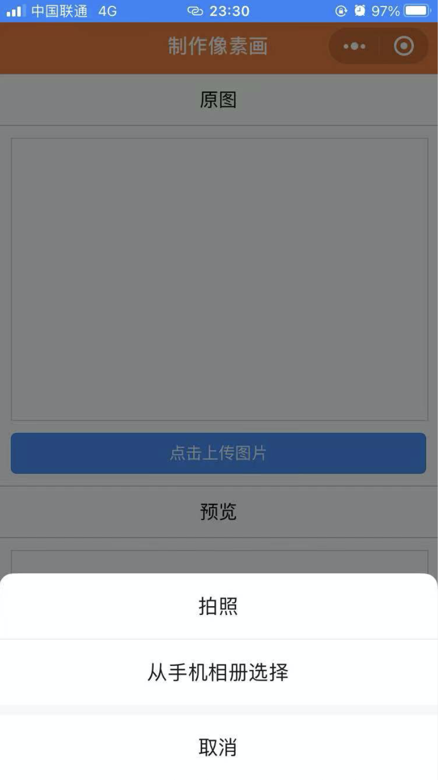 最近给自己的微信小程序上了一个制作像素画的功能。页面很简单,截图如下:就是点击上传图片按钮,可以拍照或者从相册获取图片,之后制作成乐高像素画。