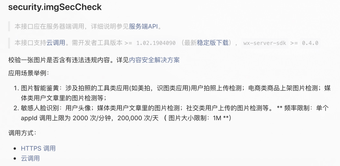 可以用来校验一张图片是否有违法违规内容,并且提供了 HTTPS 调用和云调用方式。