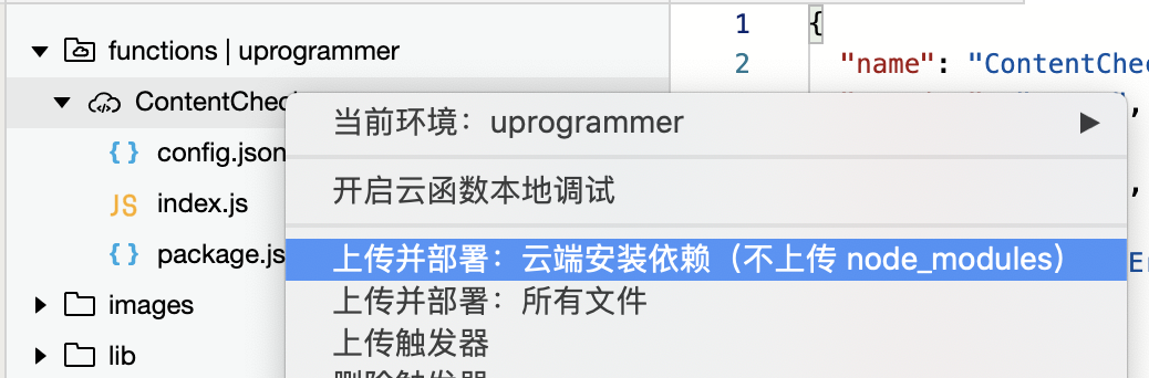 ,选择"上传并部署:云端安装依赖(不上传 node_modules)"。