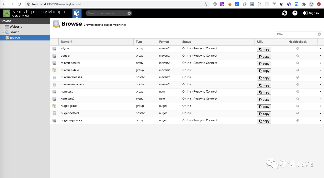 group:仓库组,用来合并多个hosted/proxy仓库,当你的项目希望在多个 repository 使用资源时就不需要多次引用了,只需要引用一个 group 即可。