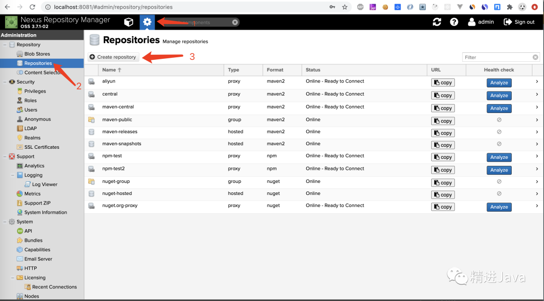 proxy:代理仓库,它们被用来代理远程的公共仓库,如 Maven 中央仓库。