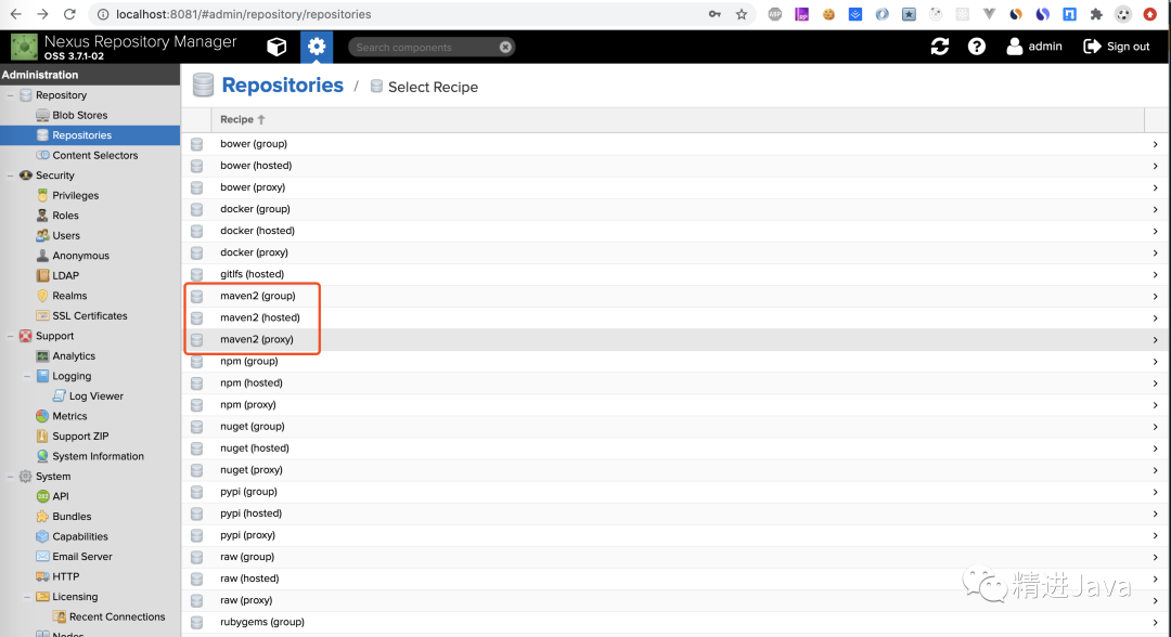 可选 Maven2 group、hosted、proxy 类型。