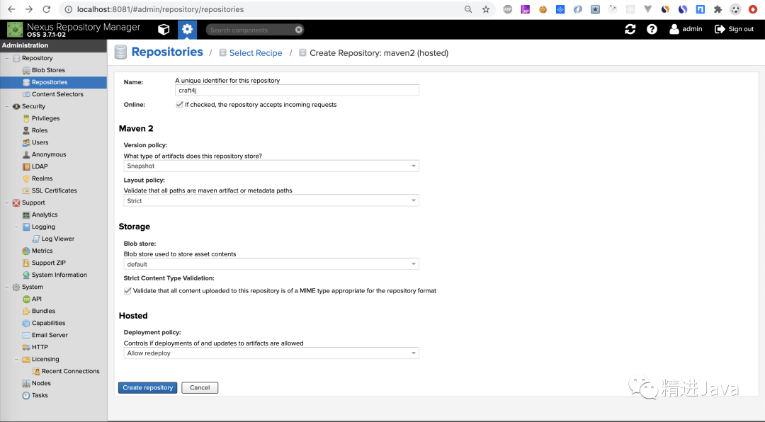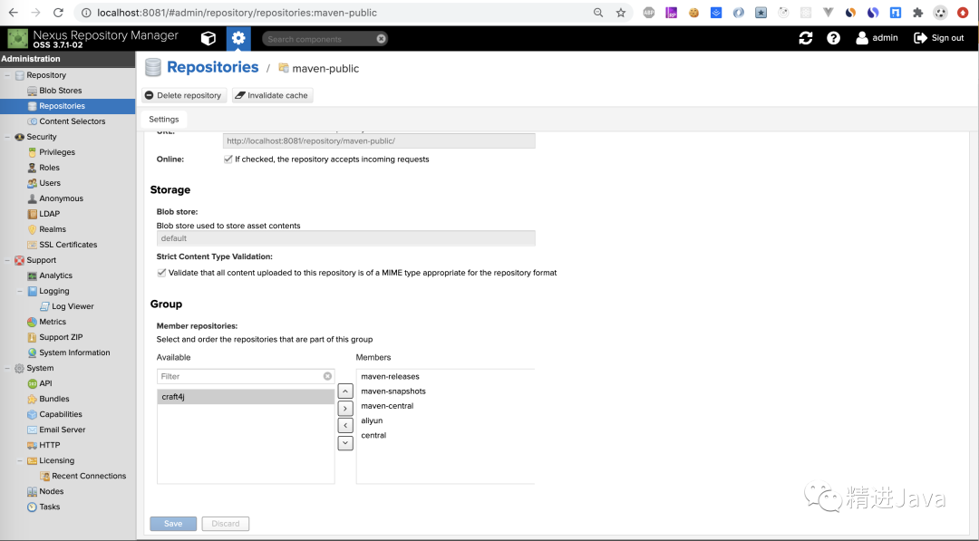 在上面的步骤中,已经将新建的 craft4j 仓库添加到 maven-public 仓库组中。