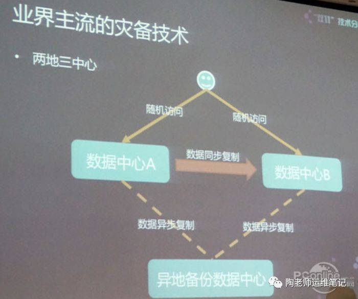 异地备份数据中心通过异步复制去走,但是两地三中心很明显的是异地备份的数据中心是不起用的,正常情况下不对外服务,所以用户不会访问到异地的点。原因是因为数据从生产级数据中心到异地的节点是异步去复制,所以整个有延时。这是整个业界目前用的比较多的业界。
