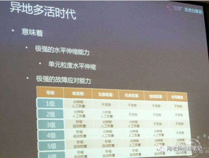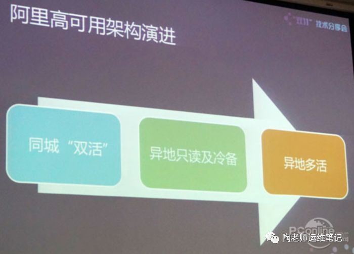 在完成同城双活的改造之后开始尝试异地,最早尝试的是只读业务和冷备,把阿里的某些业务部署到另外一个城市去,开始只是冷备用,决定把只读业务在异地起用,比如说像搜索等等算只读。但是发现对于阿里业务来讲,只读业务很难抽象,因为只能服务只读业务,如果有写就不能做。如果写的话,就意味着写到另外一个城市,这个延时接受不了,后来只读也觉得没有太大意义。当阿里完成同城双活以及异地只读、冷备尝试以后,阿里的阶段也是两地三中心,跟两地三中心是一样的。可以认为是两地三中心稍微的升级版本,因为只读业务有部分的开放,有一部分的进步,但不是最理想的状态。
