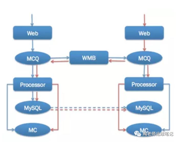 微博的异地多活方案如下图(三个节点类似,消息同步都是通过WMB):