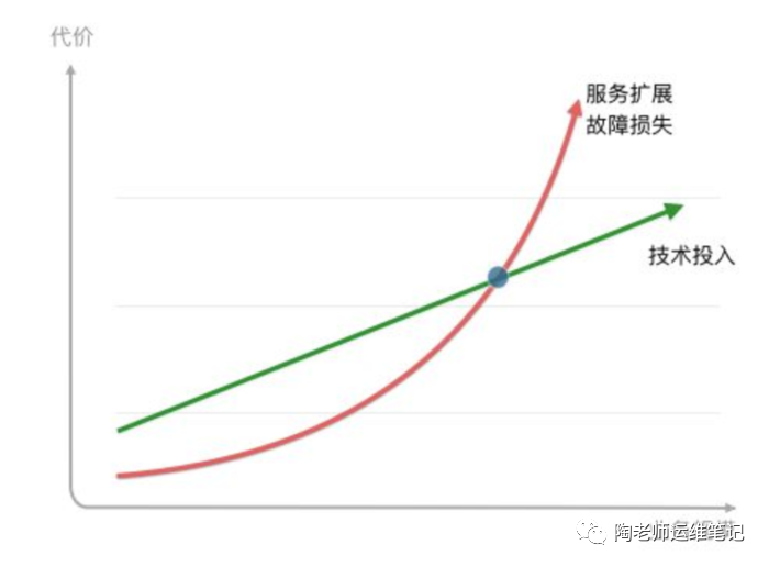 对于一个业务快速增长的企业,每次故障带来的损失也相应是加速增长的,而技术的投入总体上是线性的,初期故障损失小于技术投入,在某个时间点,故障的损失会超过技术投入,这时就要用一些高可用方案,来避免故障,多活就是其中最重要的一种。