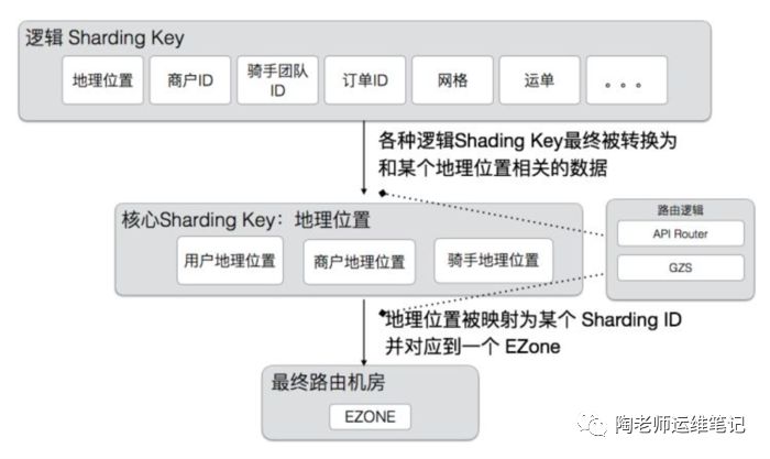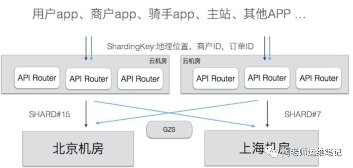 API Router是一个HTTP反向代理和负载均衡器,部署在公有云中作为HTTP API流量的入口,它能识别出流量的归属 shard ,并根据 shard 将流量转发到对应的 ezone。API Router 支持多种路由键,可以是地理位置,也可以是商户ID,订单ID等等,最终由 API Router 映射为统一的 Sharding ID。