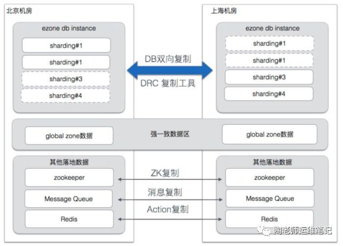 可用性优先: 当发生故障切换机房时,优先保证系统可用,首先让用户可以下单吃饭,容忍有限时间段内的数据不一致,在事后修复。每个 ezone 都会有全量的业务数据,当一个 ezone 失效后,其他的 ezone 可以接管用户。用户在一个ezone的下单数据,会实时的复制到其他ezone。