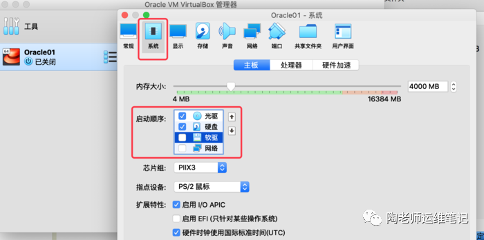 选中要设置的虚拟主机,点击“设置”按钮,“系统”–>“主板”,在启动顺序项中,选“软驱”,点右则后下的按钮,将““软驱””放到启动顺序的最后一位。然后点确认。