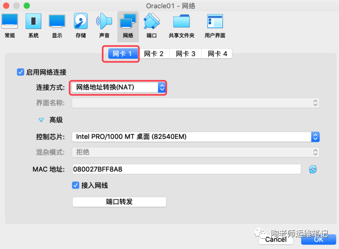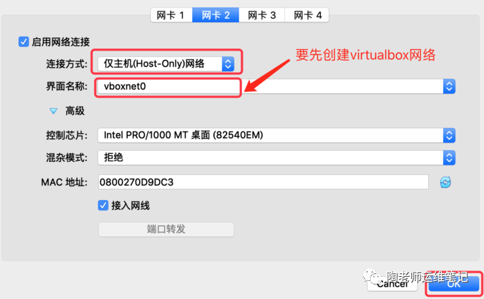 在VirtualBox中设置虚机网络,网卡1,网卡2如下: