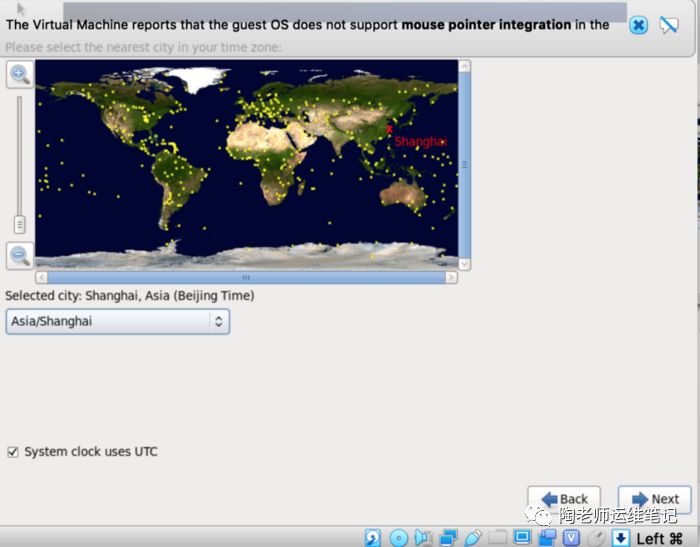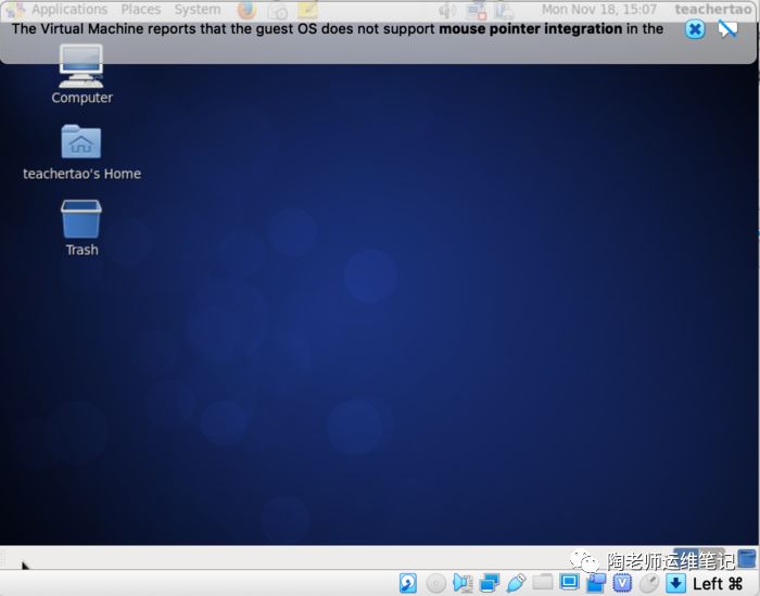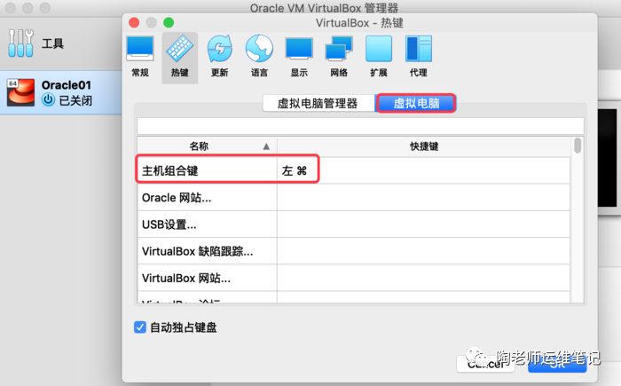 在Mac系统中“VirtualBox"–>“偏好设置”设置热键。设置热键的主要作用是,在虚拟主机的界面,按下左"Command"键,可以切换鼠标光标到当前电脑桌面(也就是跳出虚拟主机桌面)。