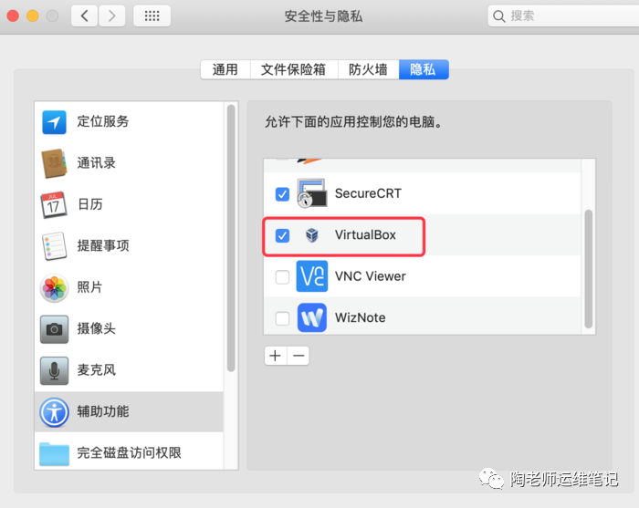 修改Mac系统偏好->安全与隐私中设置,允许VirtualBox控制电脑。