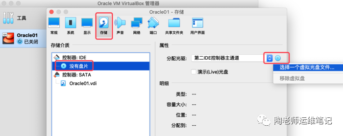 "存储"项中,选择“没有盘片”,在右则分配光驱项右则点光盘图标,再点“选择一个虚拟光盘”,然后在弹出文件选择窗口中,选择已下载的centos的iso镜像文件。