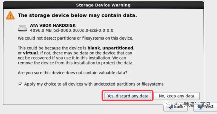 数据选择忽略所有数据(yes,discard any data),咱们是全新安装的话,直接点击:yes。