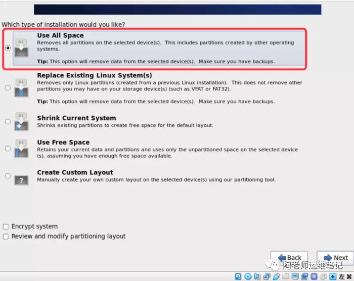图下是分区与安装了,如果是全新安装,就选择:使用所有空间。