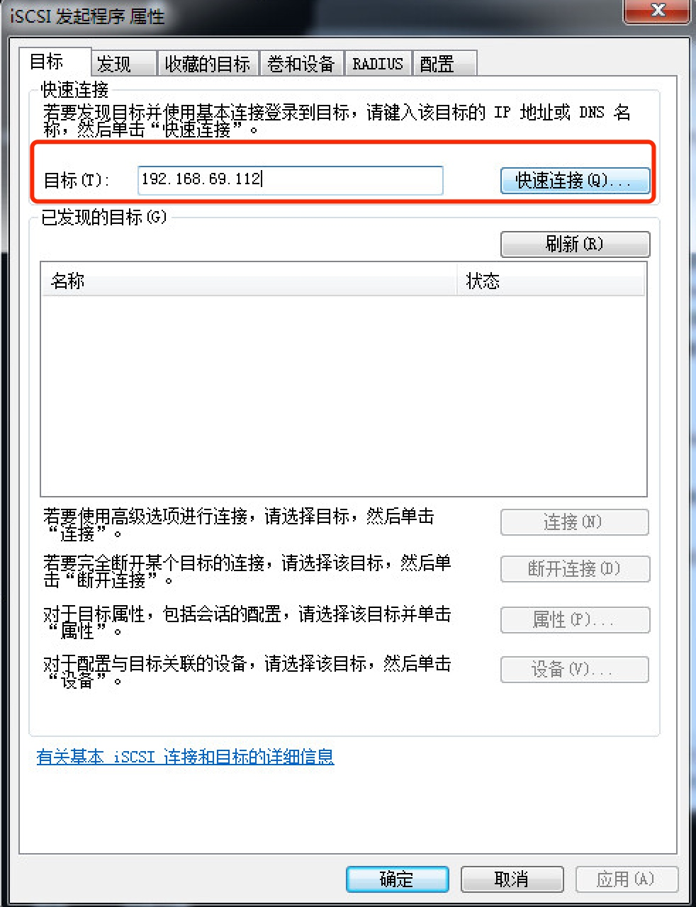 在ISCSI发起程序的目标窗口栏写入ISCSI服务端的IP地址, 单击快速链接, 如图1-3