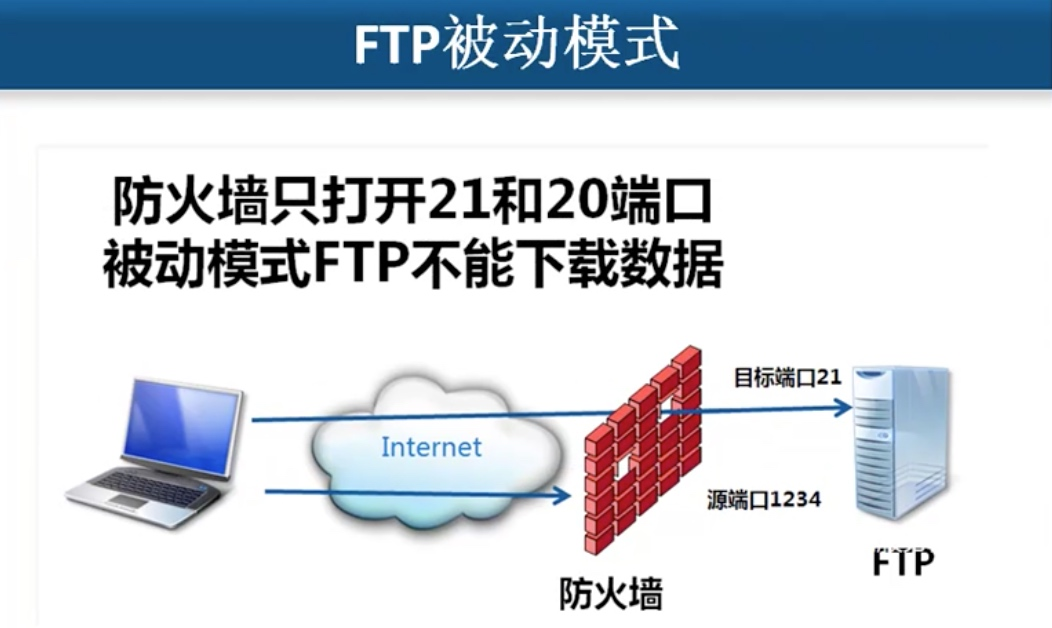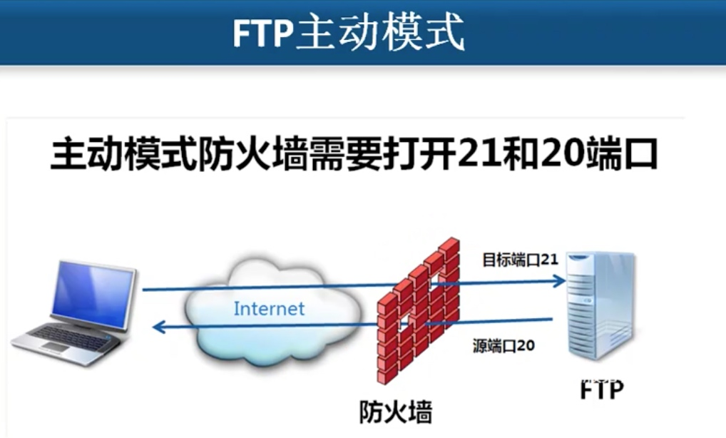 FTP服务器端启用防火墙, 开启21/20端口,这时FTP只能工作在主动模式