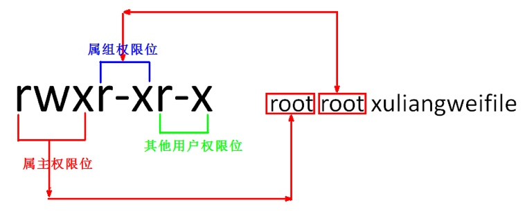 Linux中的文件或目录的权限和用户及用户组关联很大,Linux中每个文件或目录都有一组共9个基础权限位,每三个字符被分为一组,他们分别是属主权限位(占三个字符)、属组权限位(占三个字符)、其他用户权限位(占三个字符)