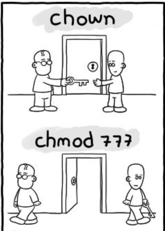 chmod: Linux中用来改变某个文件的访问模式的命令, 如漫画中所示, chmod 777会将大门敞开, 谁都可以进出。(租房)