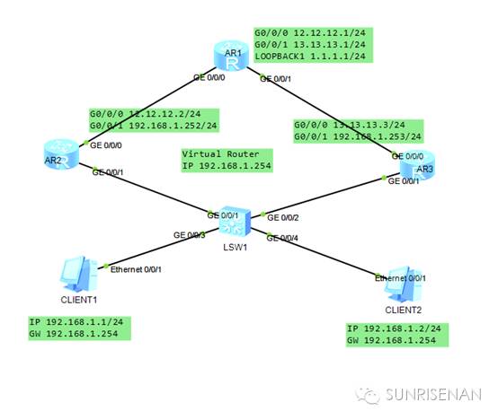 [AR3-GigabitEthernet0/0/1]vrrpvrid 1 virtual-ip 192.168.1.254