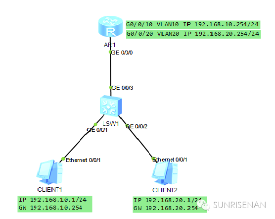 [AR1-GigabitEthernet0/0/0.20]ip address192.168.20.254 24