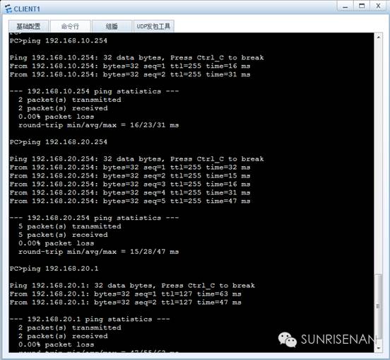 4)设置路由器子接口,指定合适的vlan及ip地址,并进行检测。