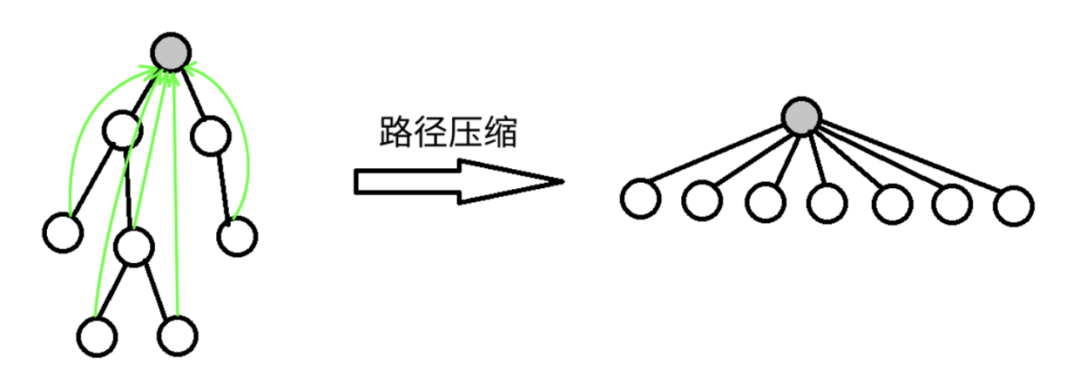 在一个集合内,我们其实只关心每个子节点所在集合的代表是谁,并不关心它的父亲是谁。如果把在路径上的每个节点都直接连接到根上 ,则提高了find效率,这就是路径压缩。