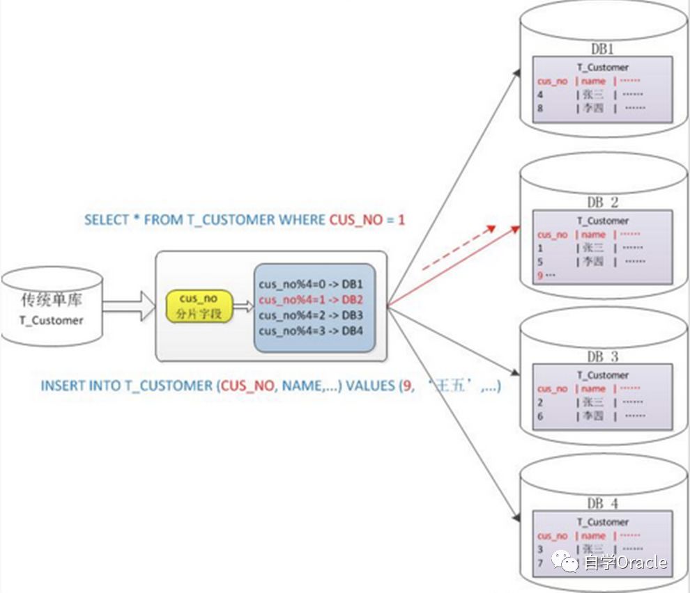 一般采用hash取模mod的切分方式,例如:将 Customer 表根据 cusno 字段切分到4个库中,余数为0的放到第一个库,余数为1的放到第二个库,以此类推。这样同一个用户的数据会分散到同一个库中,如果查询条件带有cusno字段,则可明确定位到相应库去查询。