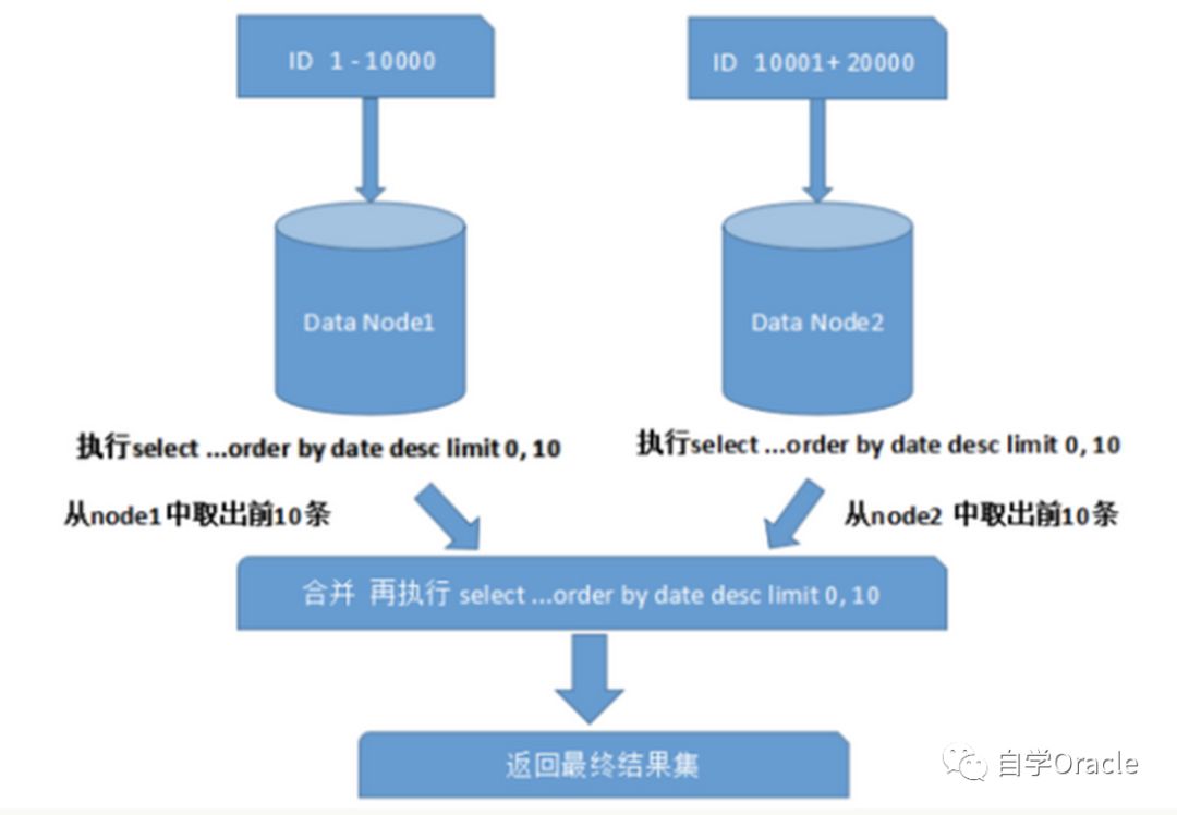 跨节点多库进行查询时,会出现limit分页、order by排序等问题。分页需要按照指定字段进行排序,当排序字段就是分片字段时,通过分片规则就比较容易定位到指定的分片;当排序字段非分片字段时,就变得比较复杂了。需要先在不同的分片节点中将数据进行排序并返回,然后将不同分片返回的结果集进行汇总和再次排序,最终返回给用户。如图所示: