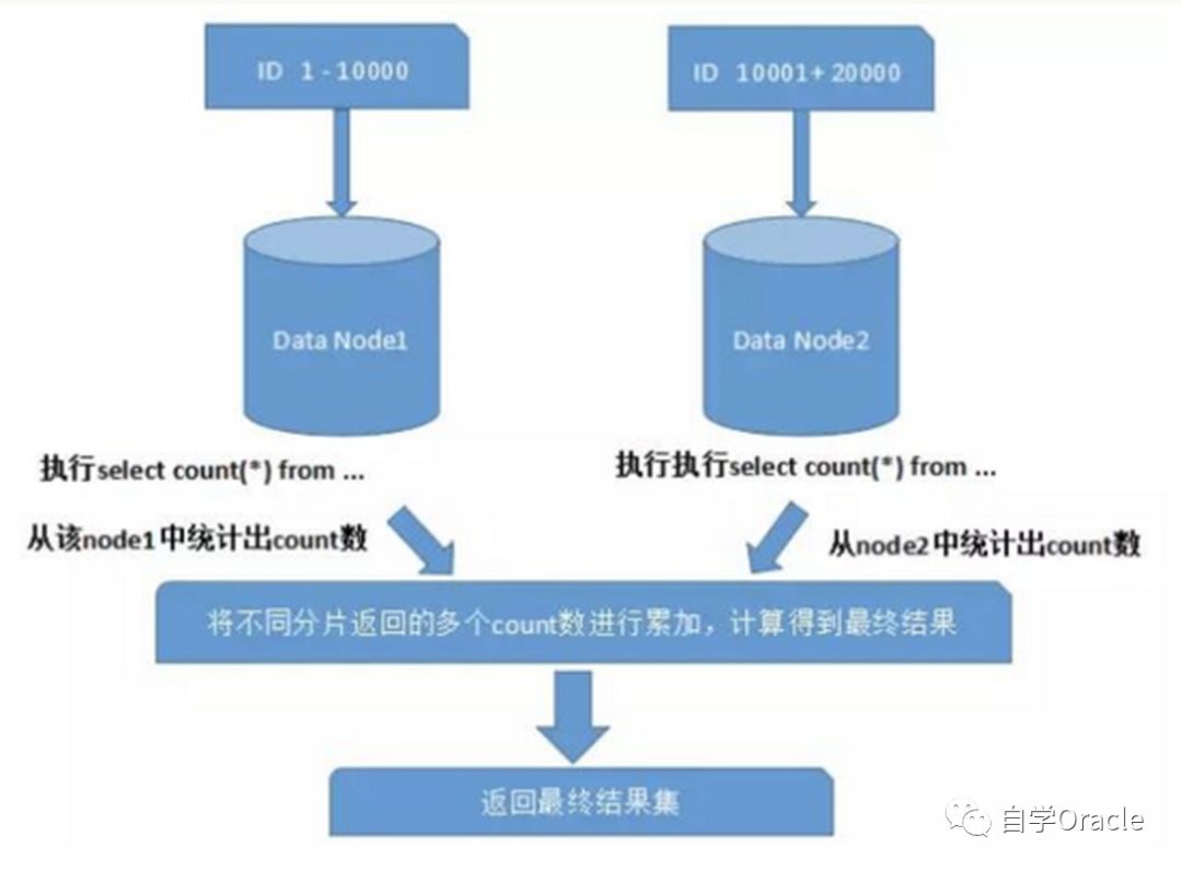 在使用Max、Min、Sum、Count之类的函数进行计算的时候,也需要先在每个分片上执行相应的函数,然后将各个分片的结果集进行汇总和再次计算,最终将结果返回。如图所示: